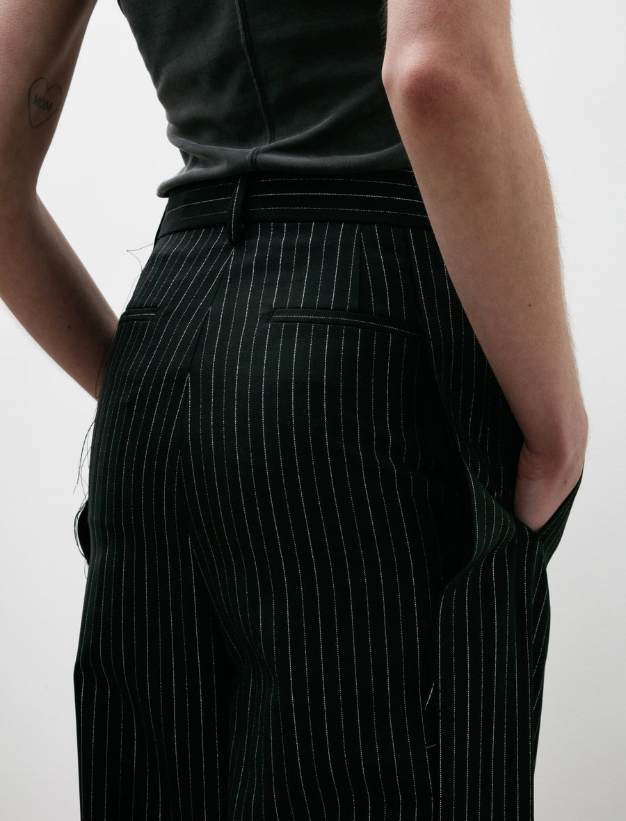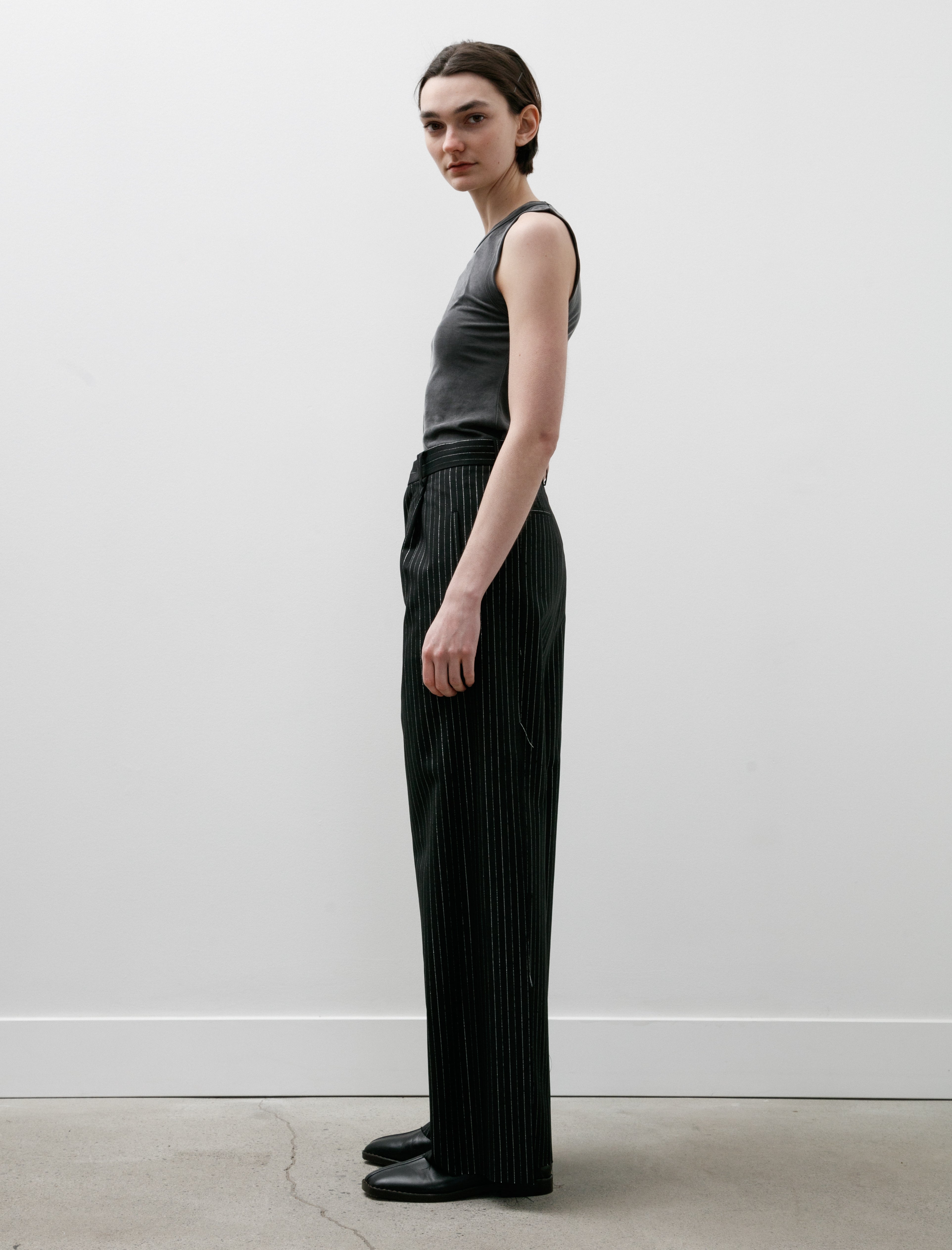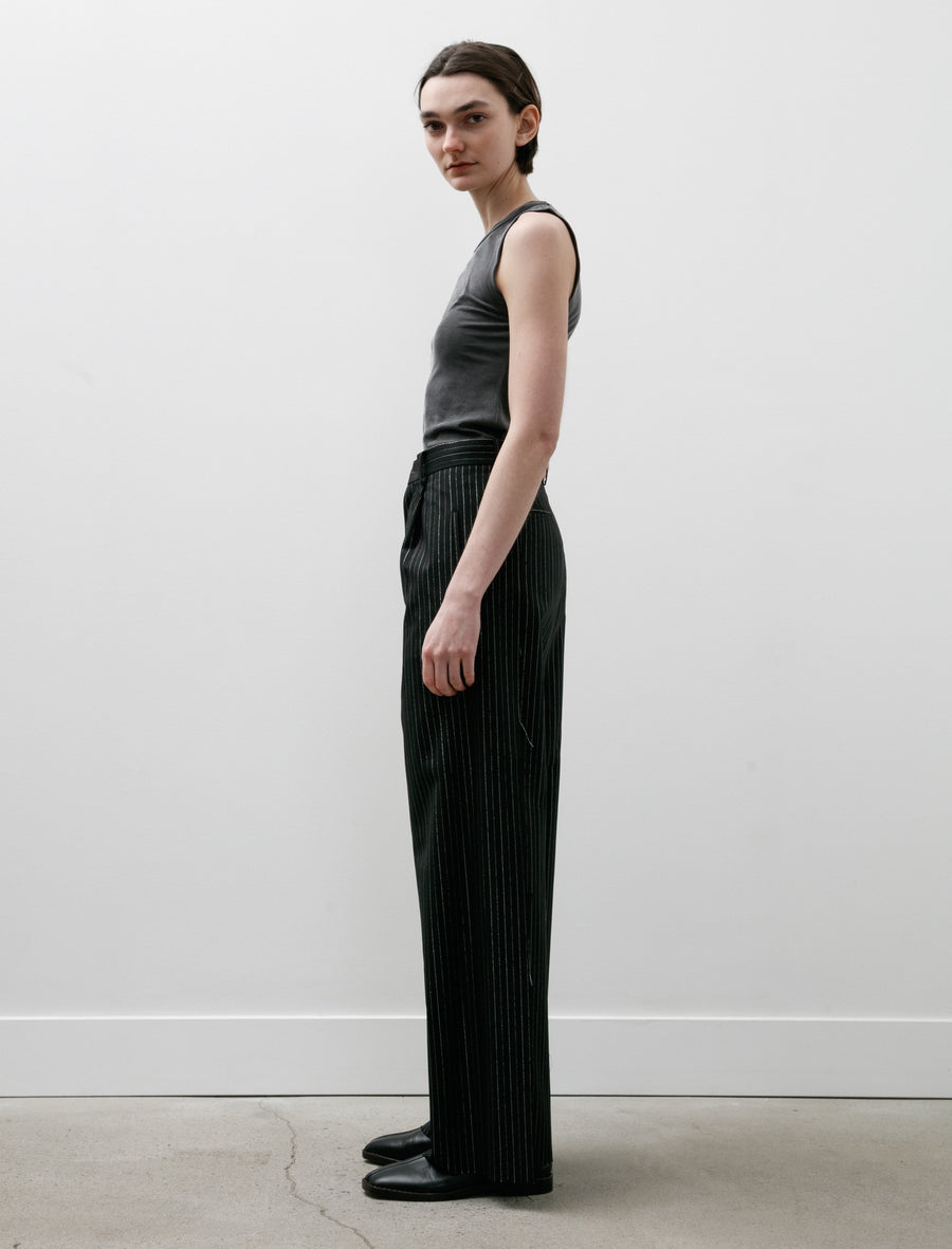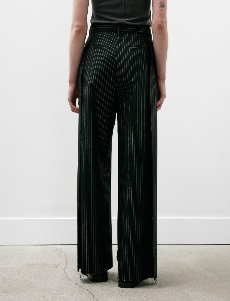 A pair of striped trousers like no other. Made from a lightweight wool blend fabric, a pinstripe pattern of silver glittery thread lays on top of a black backdrop. They have a super high rise that complements a roomy fit through the leg. At the side seams, an extra panel of fabric that trails down the length of the leg curves around the back with a raw edge for an extra touch of something special. An unfinished hem gives these trousers a modern edge that blends seamlessly with timeless elements, allowing you to wear them for a myriad of occasions.