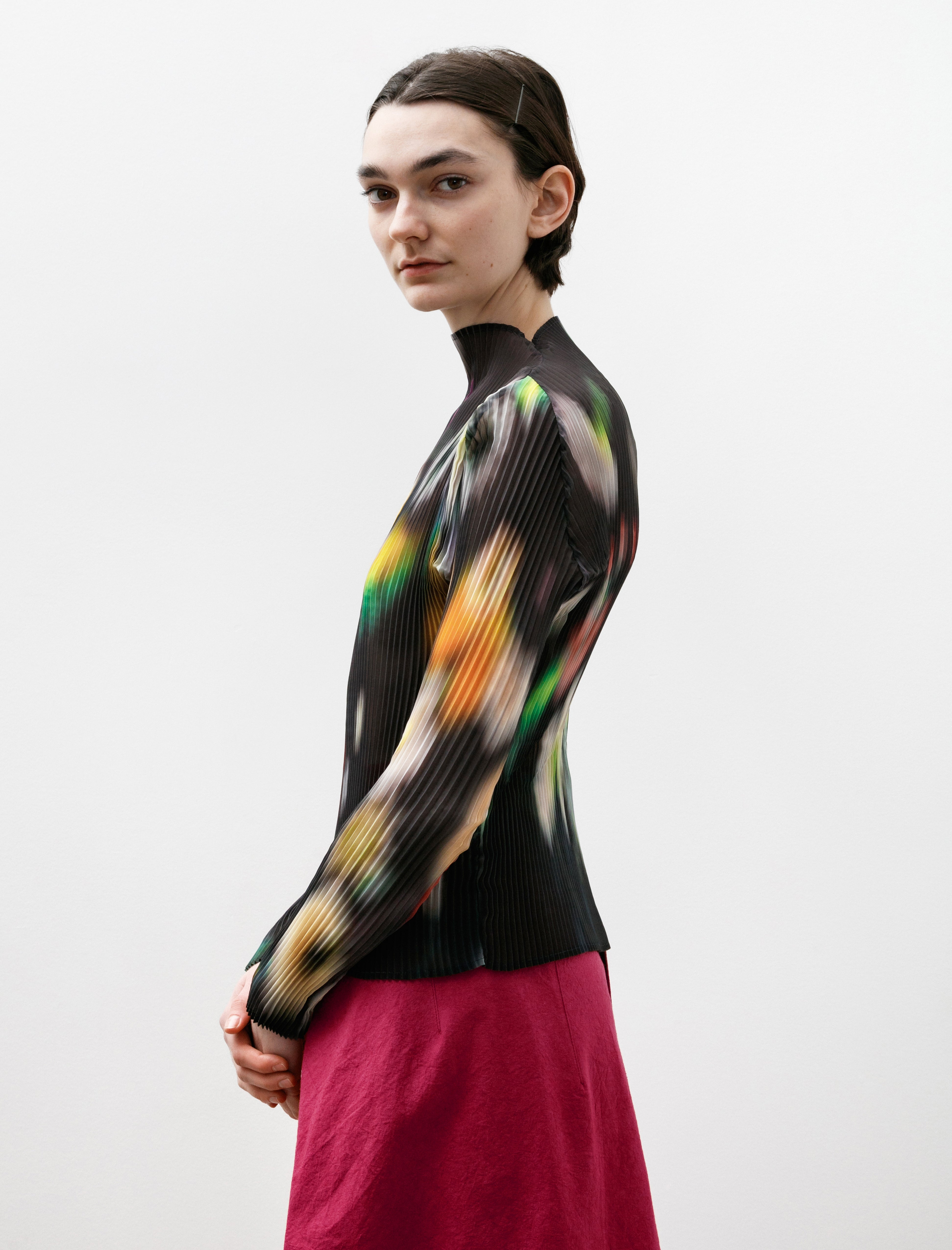 A slim fitting long sleeve with an other-worldly print . Made from a lightweight, subtly sheer fabric, it showcases traditional Shibori pleating techniques that are all done by hand. It has elongated sleeves and a wide, high neckline for added elegance. A stunning multicoloured pattern on a dark background has been designed in house to ensure exclusivity. A breeze to style, this top can be dressed up with an elegant skirt, or wear it more casually with your favourite trousers.