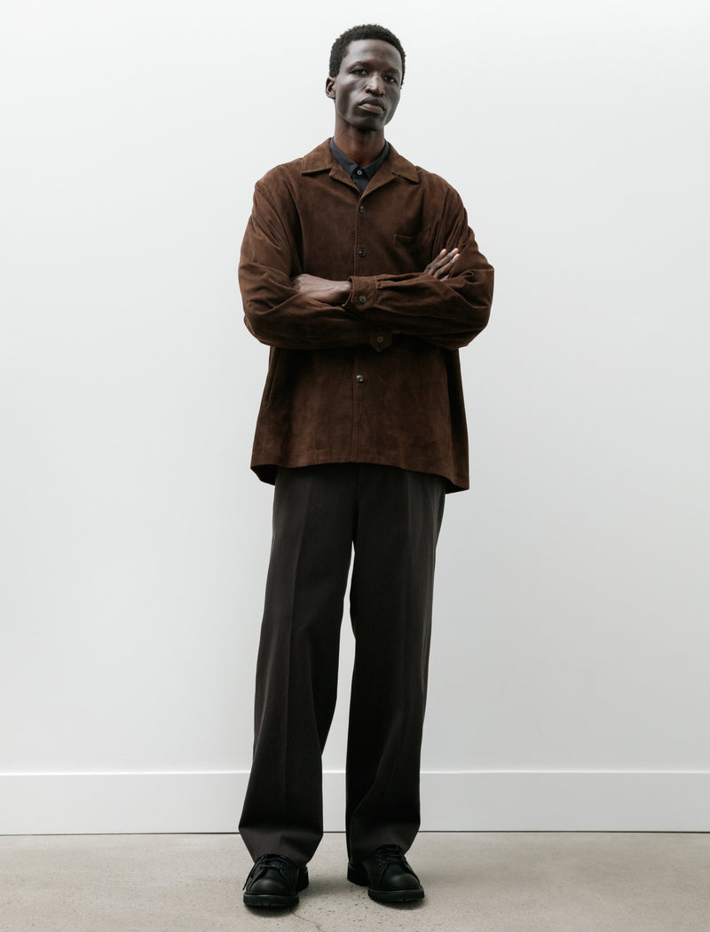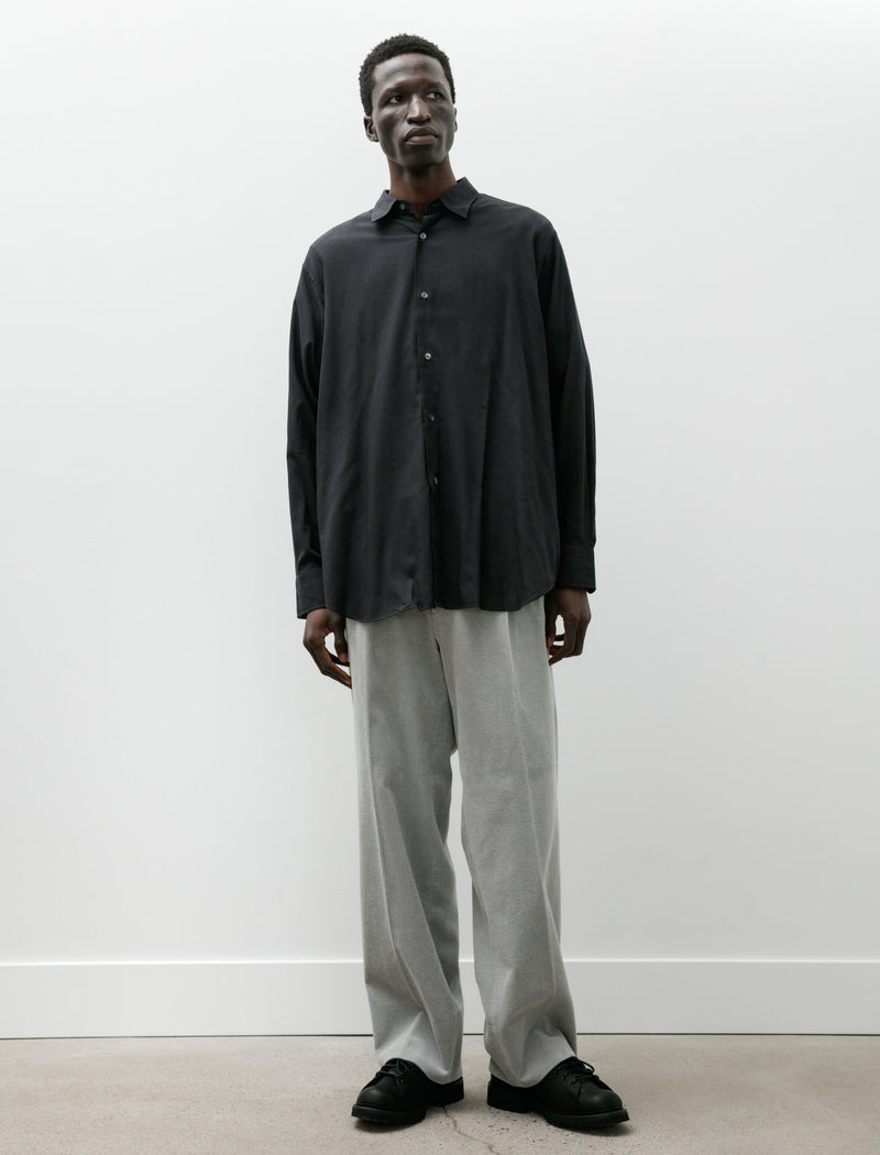 A relaxed fitting pullover hoodie cut from a super fine 160 gauge wool jersey with a high pile fleece backing in a deep charcoal grey. Features a drawstring at the hood, a kangaroo pocket, ribbed cuffs, and a ribbed hem. Raglan sleeve construction provides a natural roll line at the shoulder allowing the silhouette to hang gracefully with soft plush drape throughout the silhouette. Remarkably warm for its weight, the 160’s hoodie offers a sense of comforting protection without feeling weighty.