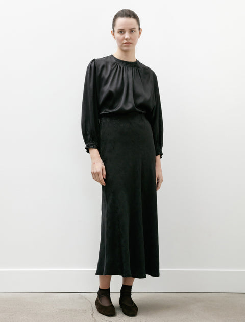 Delicate and timeless, this skirt from Bode is incredibly versatile. Made entirely of silk, it has a jacquard floral pattern woven into the silk that adds a subtle, romantic touch. Cut on the bias, it drapes elegantly for a fluid, flattering silhouette that hits above the ankle. Lightweight and refined, it balances effortless grace with a touch of intricate detail, making it a versatile piece for both day and evening wear.