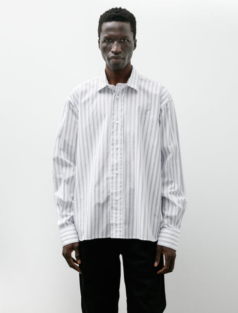 An easy, relaxed fitting, button-front shirt cut from a crisp, Albin cotton poplin in mixed blue-on-white stripe. Features a layered collar design with overlapping tab extensions at the closure, a clean finished bias-cut split yoke with subtle pleating at the shoulders, and a curved hem with side reinforcement gussets. Gently cropped proportions through the body combine with expertly cut sleeves for a sense of elegant balance, allowing the body to move freely without the need for excessive volume. Constructed using fine, single needle flat felled seams throughout for a long lasting, encased finish; completed with hand-shanked Mother of Pearl buttons.