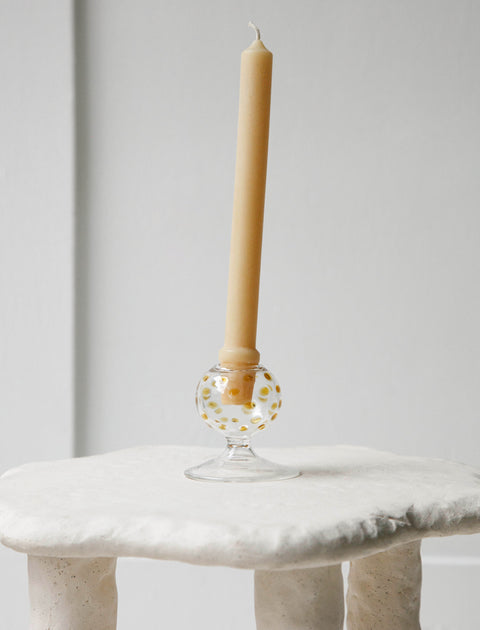 An effervescent candleholder, made from mouth-blown borosilicate glass.