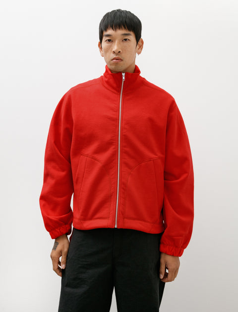 A loose fitting, boxy, full-zip sweatshirt cut from a super dense, dry, carded fleece jersey in scarlet red. Features a YKK zipper, a standing collar that can be worn up or down, patch pockets at the waist, and tie drawstrings at the side seams. Generous modified raglan sleeves offer a sense of lightly structured volume, complementing the easy proportions for a sense of effortless utility. Constructed using flat locked seams throughout for a low profile finish that leaves a smooth comfortable interior.