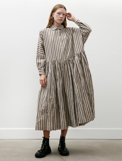 Designed for a day on the go, this charming striped dress offers a playful take on sophistication. Made of the brand’s signature paper cotton fabric in beige with vertical stripes of brown, green, and black, it is crisp and lightweight with a subtly crinkled texture that will only get better with time. Accented with a sweet polo collar and button placket, this dress has a dropped waist that gives way to a generous-fitting pleated skirt with all the drape and movement we adore. Designed with seamless shoulder construction and side pockets, it is incredibly comfortable and functional, making dressing any time of year a breeze.