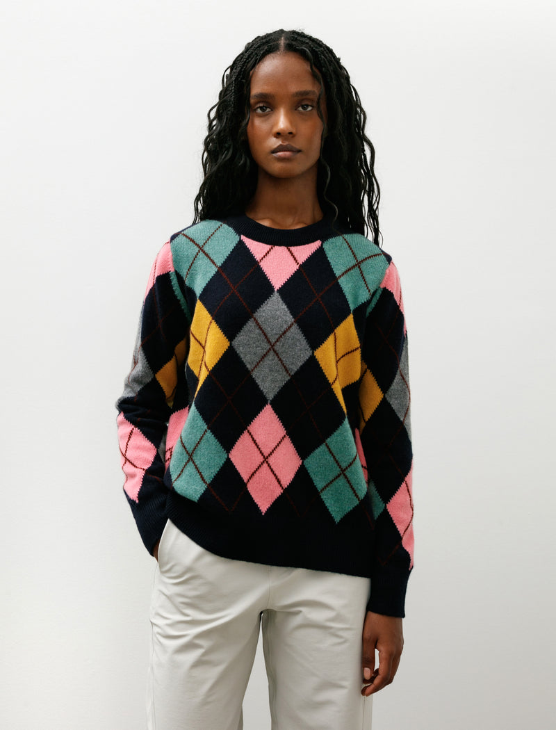 Charming and timeless, this argyle pullover from &daughter adds some cheer to any cool-weather wardrobe.This knit is made using the technique of fully fashioning for classic construction from Geelong wool yarn, renowned for its luxuriously soft handle. An argyle pattern of pink, green, grey, yellow, and burgundy lies on top of a navy backdrop. The subtly slouchy silhouette is complete with ribbed detailing at the cuffs, hem, and neckline for a classic touch.