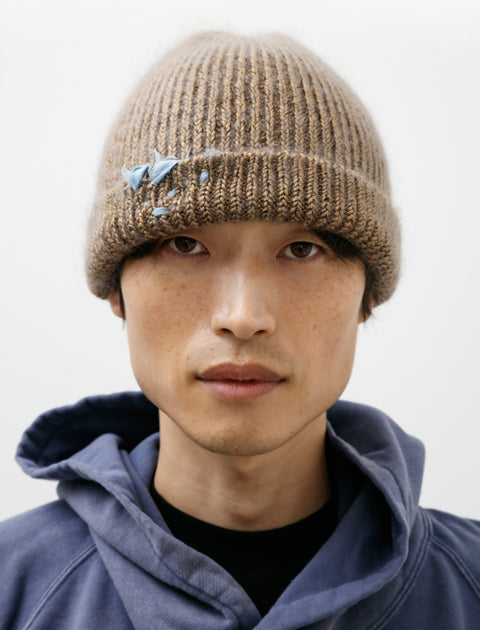 A classic ribbed beanie knit from a super fine, shaggy mohair/silk yarn in a rich soft medium brown. The warmth of the brown is enhanced by a subtle blue shadow effect meant to evoke water running over the surface of tree bark. Completed with accents of vintage, indigo-dyed cloth at the brim and crown, creating a sense of home spun craft that is at once playful and elegant.