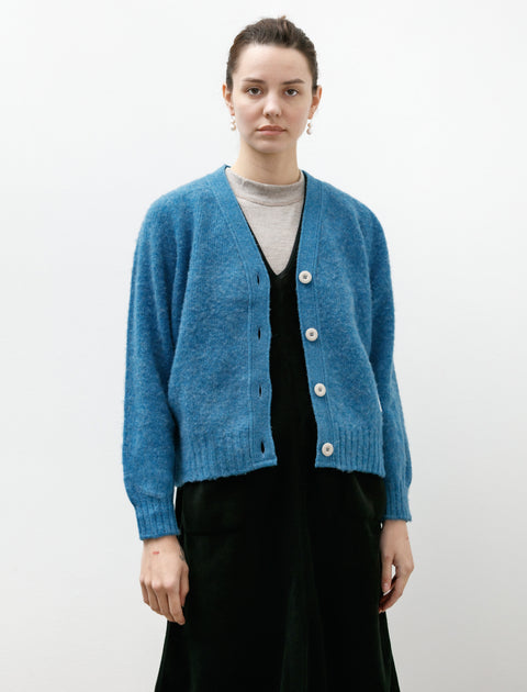A new addition for this season, this v-neck cardigan is like a warm hug. Made of a double-brushed Shetland wool, it has a soft, fuzzy hand and an ever-cozy feel. Its relaxed fit gives a sense of casual style with room for layering. Classic hallmarks include ribbed cuffs and hem, a deep v-neckline, and a button front closure. Setting this apart from any regular wool, this sweater is knit using a heavier marled Shetland yarn with an extra brushing to the Shaggy Bear style, making it even fuzzier. A vibrant blue colour is the cherry on top of this wardrobe staple.