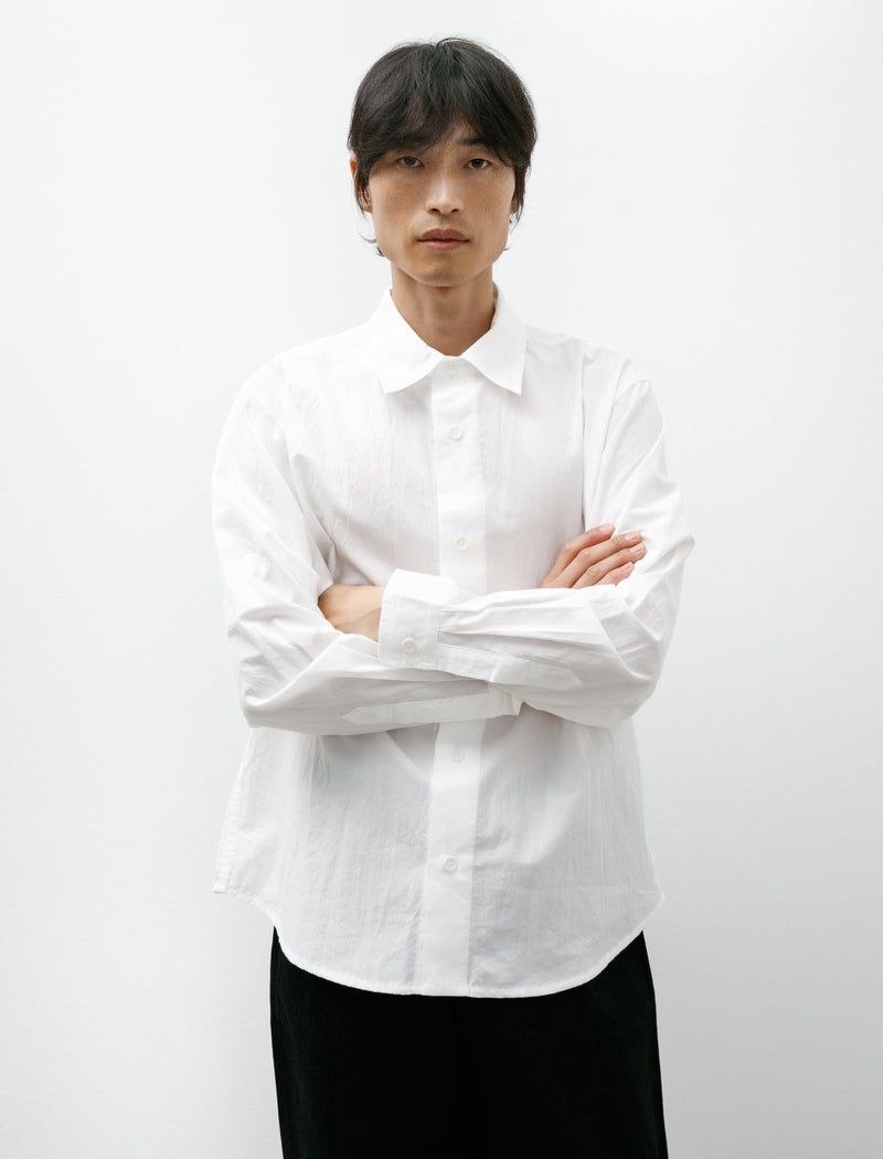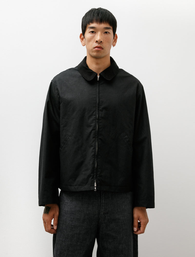 An unstructured, relaxed fitting, three-button blazer cut from a densely woven, midweight Belgian linen in black. Features a convertible collar, a notched lapel with a high breakpoint, a left breast pocket, and patch pockets at the waist. Subtle shaping throughout with a front dart and two-piece sleeves meets with easy, boxy proportions throughout and the swung drape of the linen for a sense of soft, effortless elegance. Constructed using flat felled seams and a bias-bound armhole for a long lasting, clean finished interior; completed with a floating self-lining at the shoulders and Corozo buttons.