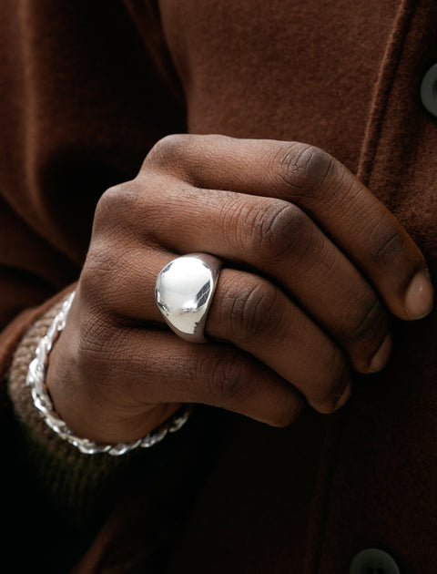 A spheroid ring cast in recycled sterling silver with a polished finish. Smoothed contours eliminate transitional surfaces, lending a sense of softness to solid material. Completed with logo and hallmark stamps at the inner band.