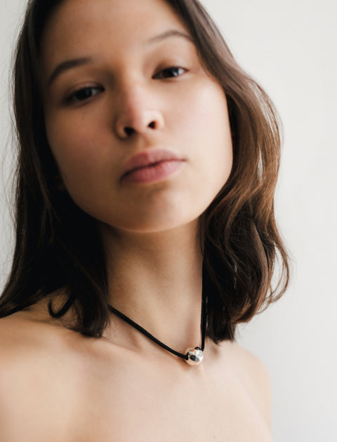A clean yet bold choker from Sophie Buhai. Made from a smooth satin cotton cord with a large sterling silver pendant, it also features a sterling silver aglet on each end of the cord. This piece can be styled on its own or layered within your favourite necklace stack.