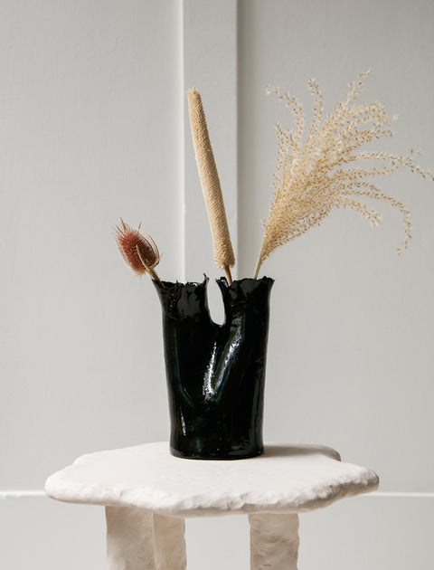 We love the robust silhouette of this vase. It features double-fluted openings that portray a nearly symmetrical silhouette. This vase features her signature torn edges and foot at the base. Perfect for holding flowers and foliage, serving as a functional work of art in any space or home.