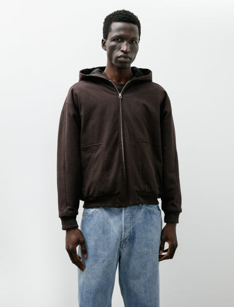 A relaxed fitting, insulated, boxy, zip-front jacket cut from Lady White Co's signature 10oz, high density rugby jersey in a deep muted brown. Features a fixed hood, a Waldes zipper, inlaid welted hand pockets at the waist, shoulder gussets that extend through the sleeves, ribbed cuffs, and a ribbed hem. Easy proportions and dropped shoulders combine for a sense of controlled volume throughout that is stabilized by the mild plushness of the quilted lining. Constructed with a full padded lining in a fine poly/cotton jersey for a long lasting, encased finish.