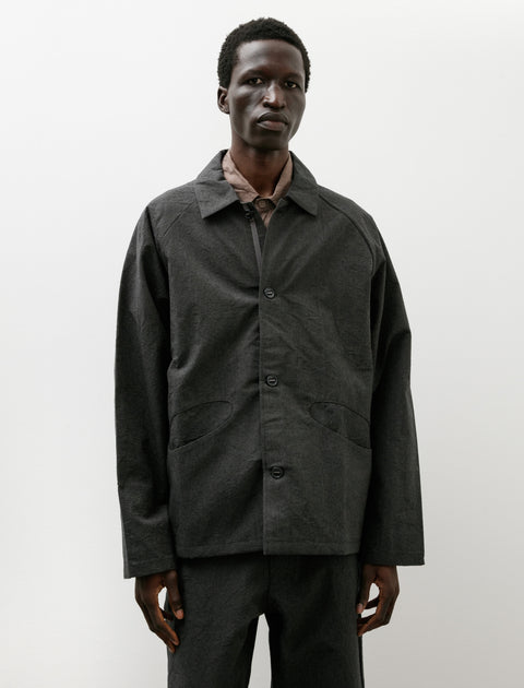 A roomy, boxy, button-front jacket cut from a dense, cotton/wool plainweave in a narrow black/grey stripe. Features a classic collar, MAN-TLE's signature military-style button closure system, and drop-in hand pockets with elliptical cut-out openings. Raglan sleeves offer a sense of natural mobility and a sloped shoulder line that produces a slightly flared silhouette that floats freely at the waist. Constructed using long lasting french seams for a clean encased finish; military buttons threaded onto nylon seatbelt tape.