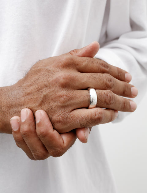 An elegantly simple chunky band ring in a high shine 925 sterling silver. With a rounded surface and a thick outer diameter, this ring is large enough to make a statement but minimal enough to remain subtle. Features a stamped logo at the interior band.