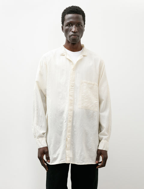 An oversized, loose fitting, button-front shirt cut from a fine, lightweight, rinsed wool calico shirting in ecru beige. Features Tender's signature rumpled collar, a left breast pocket, a large underarm pleat that produces abundant airy volume, and a flat hem. Designed without side seams and a shifted sleeve seam that meets the shoulder, the pleating at the sleeve offers a generous fit through the body that floats freely in movement. Constructed using flat felled seams throughout for a long lasting, encased finish; catseye Mother of Pearl buttons throughout.
