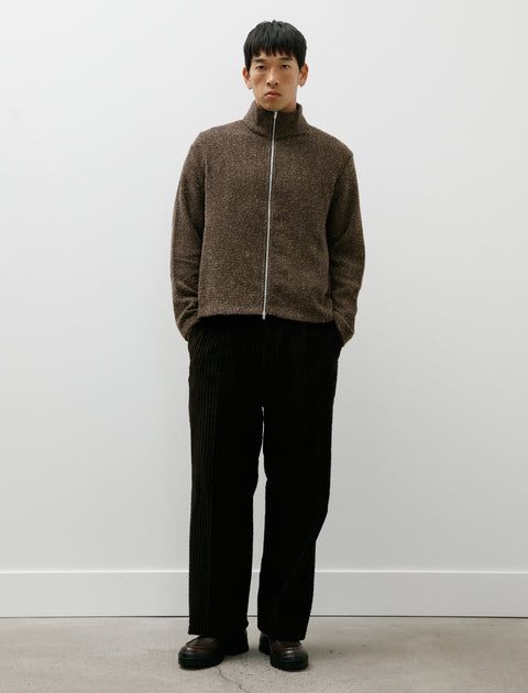 Wide fitting, tailored trousers cut from a plush, three-wale corduroy in a deep dark brown. Feature a two-point closure, a YKK zip fly, subtle half inch pleats at the waist, front slash pockets, and rear welt pockets. A closer fit through the hips expands at the thigh, remaining straight through the knee for an elegant column-like stance while the creased leg offers a sense of vertical structure. Constructed with clean finished seaming at the front and back rise for added comfort and durability through the seat, completed with blind hems.