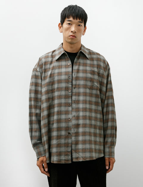 Our Legacy's signature, wide fitting, oversized, button front shirt cut from a soft, lightweight, cotton twill check in green-grey, brown, and black. Features a classic collar, a left breast pocket, a clean finished rear yoke with a central box pleat and a gently curved hem. Dropped shoulders combine with the exaggerated wide body to create a sense of volume through the sides that produces a subtly flared silhouette with abundant drape. Constructed using chain stitched, flat felled seams throughout for a long lasting encased finish; dark brown Mother of Pearl buttons.