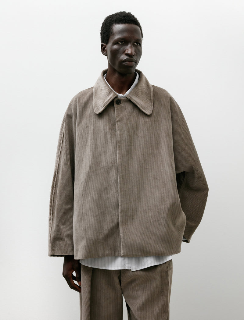 An oversized, boxy, button-front jacket cut from a ten-whale cotton corduroy with a pleasing dense hand in a muted taupe brown. Features an exaggerated curved collar, on-seam hand pockets at the waist, and dual vent pleats at the back. Dolman sleeve construction, with the sleeves cut as a continuation of the body, produce a sense of natural drape at the shoulder, while a curved side gusset lends a forward stance; a subtly drafted lift at the back hem ensures easy layering, separating individual layers at the waist to maintain comfort and drape. Constructed with a full lining in a fine tonal satin for a long lasting fully encased finish; horn buttons.