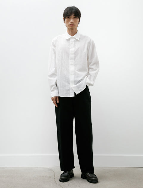 James Coward's, now classic, wide fitting, mid-rise jeans cut from a crisp, high density, yarn-dyed, one-wash Japanese denim in black. Feature reduced, minimal detailing throughout with five pocket styling and darts at the rear in place of the typical yoked construction used in denim production. A closer fit at the seat expands to a generous thigh that drops away from the leg to create an easy, column-like silhouette; a full length inseam allows for a variety of styling options from a voluminous break to a heavy cuff at the ankle. Durably constructed with chain stitched flat felled seams through the seat and inseam for a hard wearing finish that is built to last; tack button closure, zip fly.