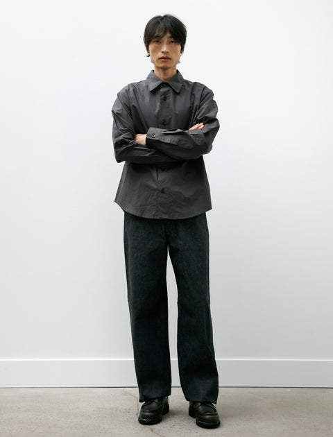 James Coward's, now classic, wide fitting, mid-rise jeans cut from a crisp, high density, yarn-dyed, one-wash Japanese denim in a blue inflected medium grey. Feature reduced, minimal detailing throughout with five pocket styling and darts at the rear in place of the typical yoked construction used in denim production. A closer fit at the seat expands to a generous thigh that drops away from the leg to create an easy, column-like silhouette; a full length inseam allows for a variety of styling options from a voluminous break to a heavy cuff at the ankle. Durably constructed with chain stitched flat felled seams through the seat and inseam for a hard wearing finish that is built to last; tack button closure, zip fly.