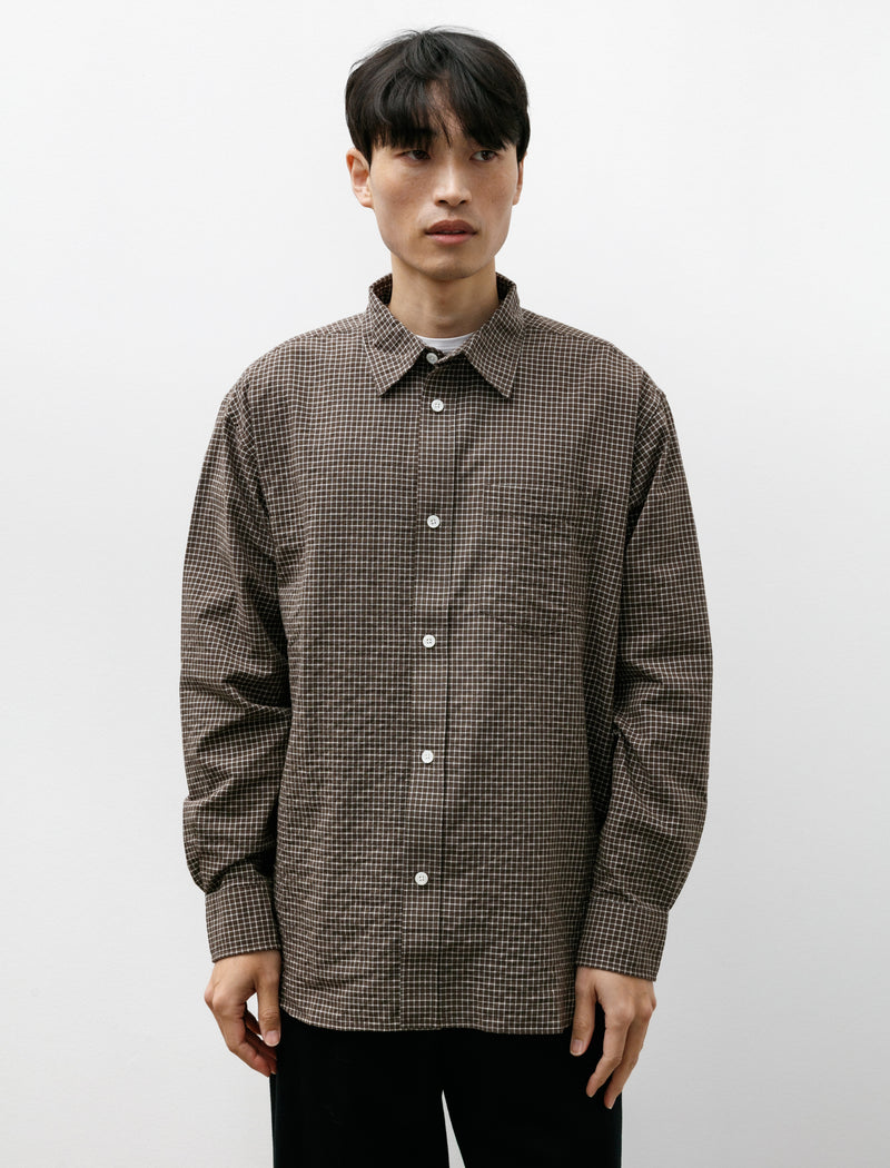 A regular fitting sweater in blended cotton mohair knit featuring a brown toned shadow stripe effect. Full fashion knit construction with knitted seams for a more long-lasting garment less prone to warping over time. Rib knit neckline, hems, and cuffs.