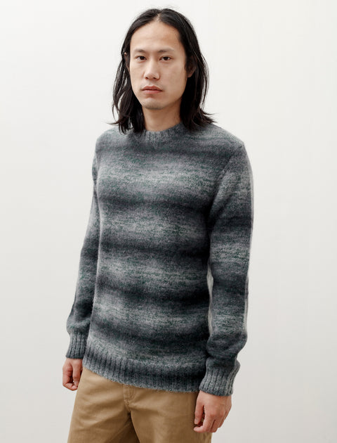 A regular fitting sweater in blended cotton mohair knit featuring a green toned shadow stripe effect. Full fashion knit construction with knitted seams for a more long-lasting garment less prone to warping over time. Rib knit neckline, hems, and cuffs.