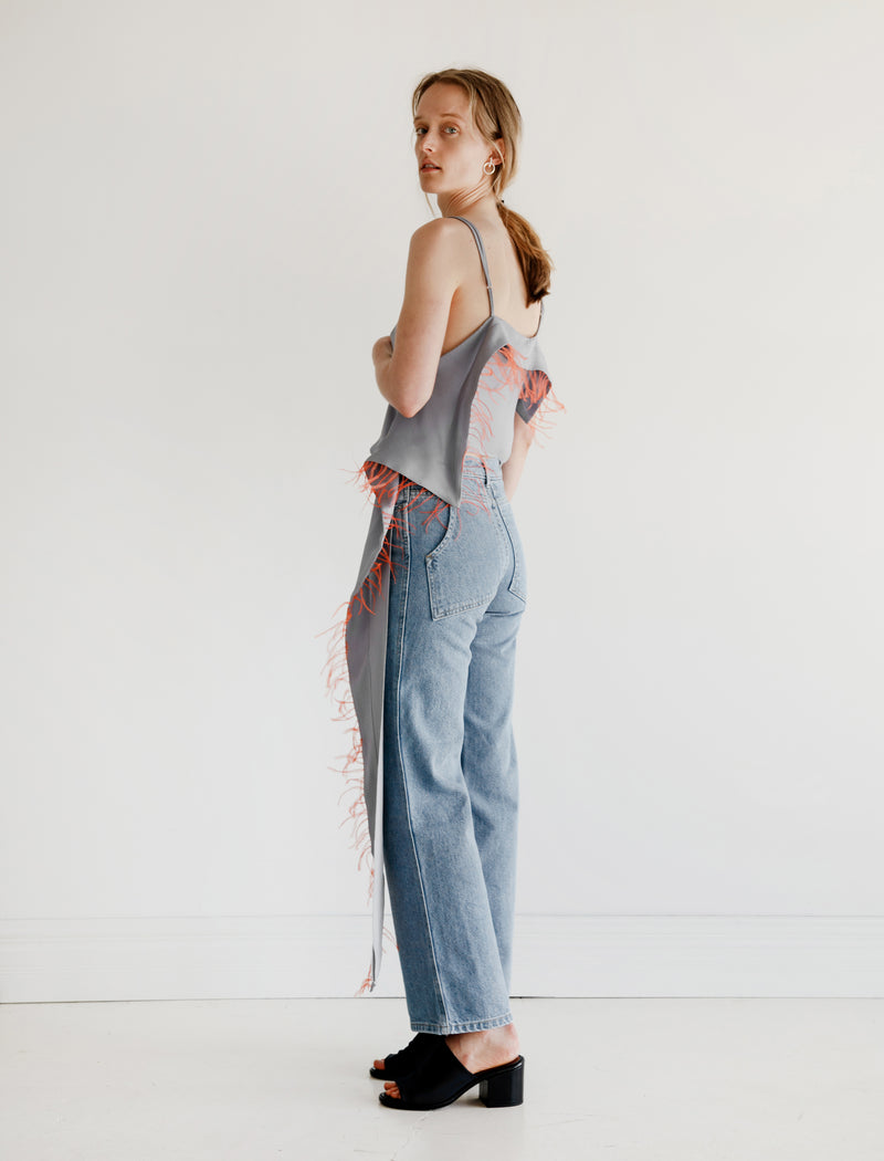It’s easy to stand out in the ‘Flutter Blouse.’ A mid-length silk tank with asymmetrical scarf panel featuring orange ostrich feathers. The panel sweeps around the backside of the top and drapes along the side of the body. Side zipper closure and adjustable straps.