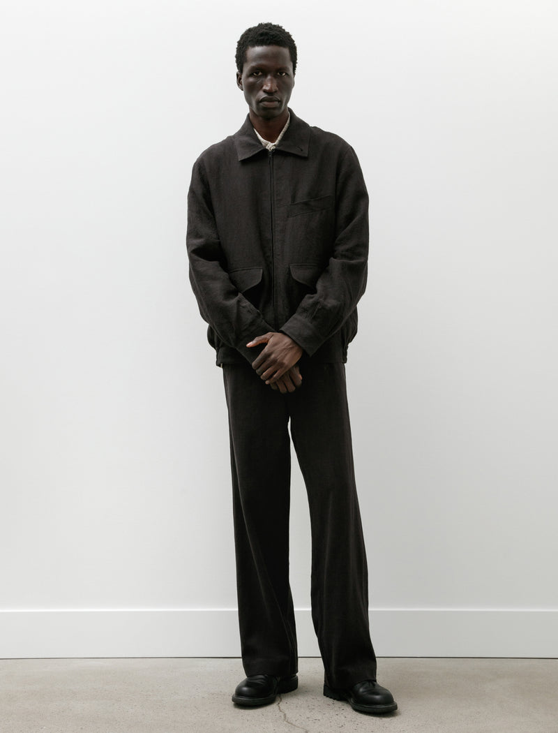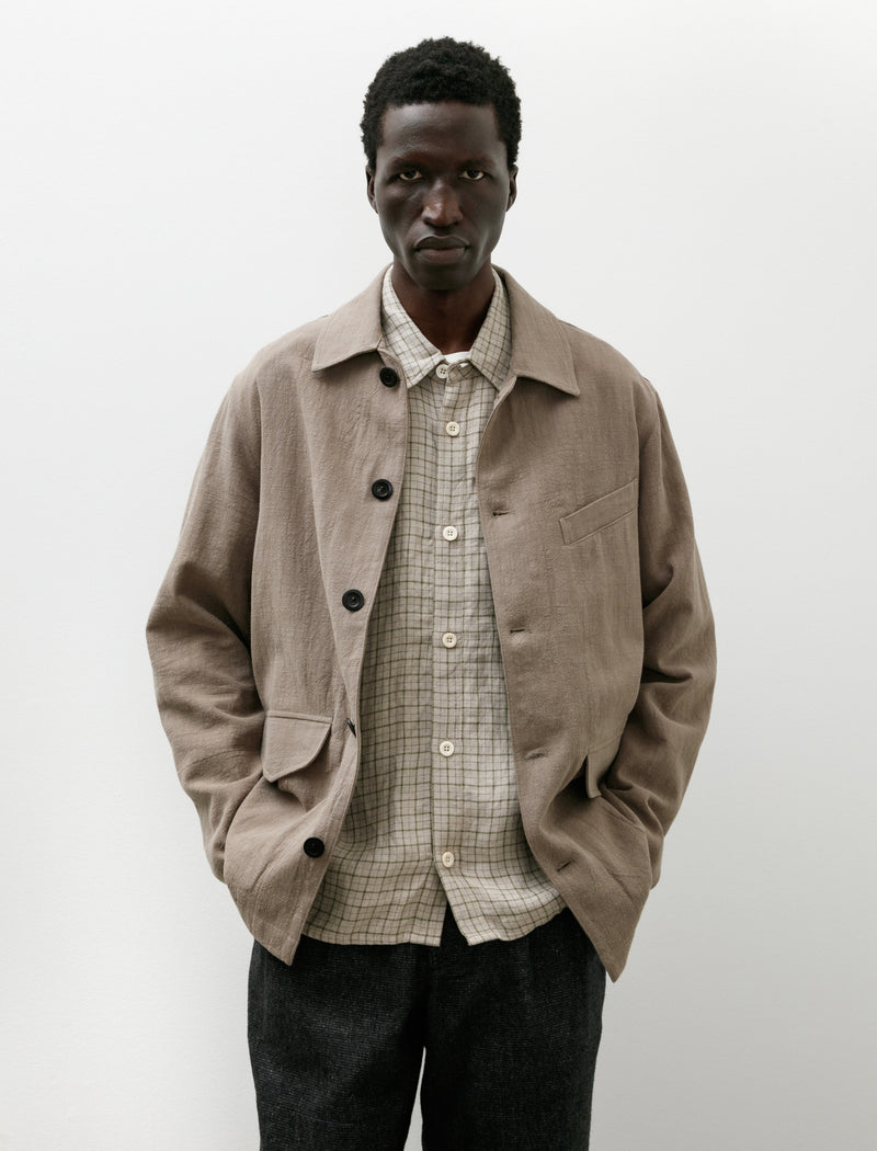 A relaxed fitting, lightly tailored, button front over shirt cut from a rugged, lightweight ramie/cotton plain weave with a rich slubbed texture in a cool sand beige. Features an open convertible collar with a rounded lapel corner, a left breast pocket, flapped welt pockets at the waist, and a clean finished rear yoke with pleats at the shoulders. Easy proportions through the body offer a sense of timeless utility and provide soft volume while tailored sleeves balance the silhouette and complement the elegant pocket detailing. Constructed using flat felled and french seams throughout for a long lasting, encased finish; made in England Corozo buttons throughout.