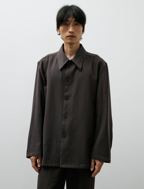 A relaxed fitting, boxy, button-front shirt jacket cut from a soft, densely woven wool/cotton gabardine with a subtle wrinkled texture in a warm slate grey. Features a sharply pointed collar, an inner breast pocket, and a flat hem with split side seams. Subtle dropped shoulders combine with a gentle curve through the sleeves to blend drape through the body into the sides while maintaining a sense of casual elegance. Constructed using fine single needle flat felled seams for a long lasting finish; Corozo buttons.