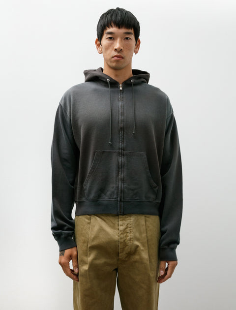 A trim fitting, cropped, zip hoodie cut from a fine, smooth surfaced, pima cotton terry fleece in a faded garment dyed black. Features a Waldes zip closure, a drawstring at the hood, hand pockets at the waist, ribbed cuffs, and a ribbed hem. The close fitting proportions combine with the shortened silhouette and irregular fading for a sense of timeless, lived-in ease. Constructed using cover stitched reinforcements throughout for a smoother interior and enhanced durability.