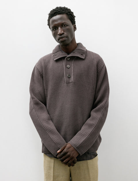 A relaxed fitting sailor-style five button polo sweater knit from a fine cotton rope yarn in a muted clayey purple with a pleasing dry hand. Easy proportions throughout with a semi-tailored armhole produce a soft silhouette showcasing the plush drape of the knit that is accented by a high stranding collar. Constructed using full-fashion knit panels and linked seams throughout for a long lasting finish that is highly resistant to warping over time; matte finished oversized dark Mother of Pearl buttons.