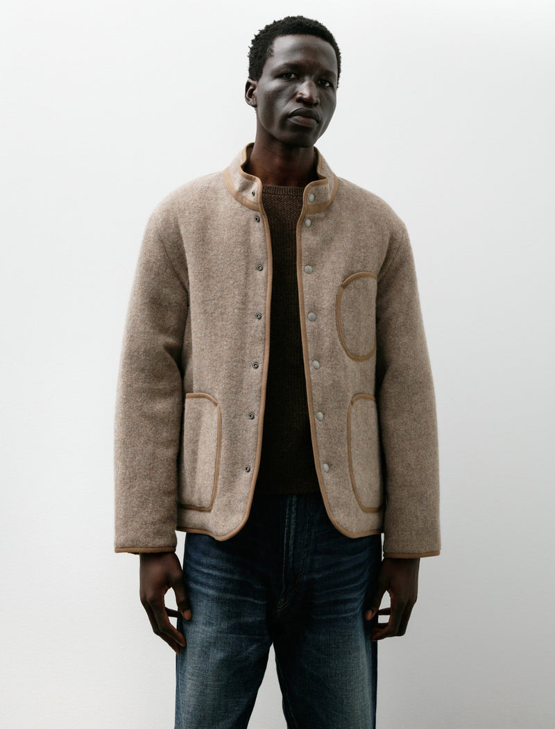 A relaxed fitting, boxy, high neck turtleneck based on a pattern distributed by the American Red Cross during the 1940's. The fine lambswool yarn achieves a subtle melange colouration and remarkable softness by blending with rare white cashmere. Double knitting techniques throughout the body produce a dense hand while "garter stitch" detailing at the shoulders and side seams pay homage to the original pattern. Constructed using full fashion panels and linked seams for a long lasting shape that minimizes waste in production.