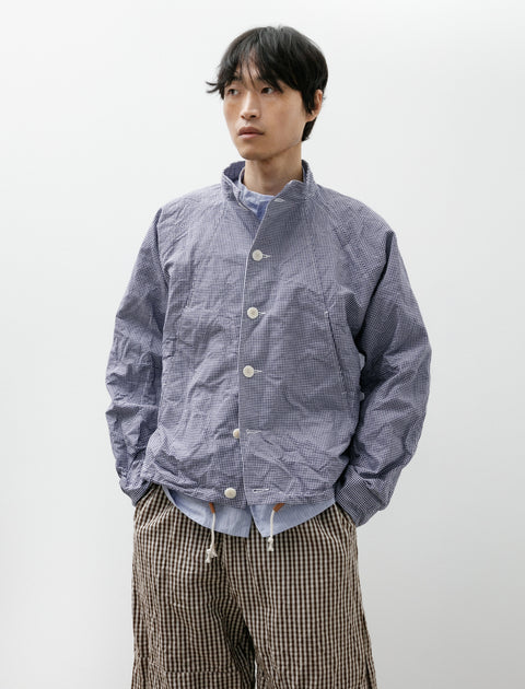 A relaxed fitting, boxy, button-front jacket cut from a midweight, cotton mini check with a coarse dry hand in blue and white. Features a standing collar cut as a continuation of the front body panel, on-seam hand pockets at the mid-chest, and a natural cord drawstring with natural veg-tan toggles. Raglan sleeves combine with princess-style panels for a soft shouldered silhouette with volume concentrated through the sides; darted two-piece sleeves offer a graceful forward stance, cinching the provided drawstring allows for dynamic bloused volume. Constructed with a full lining in an undyed, crisp cotton plain weave including two inner breast pockets for a fully encased finish; undyed Corozo buttons.