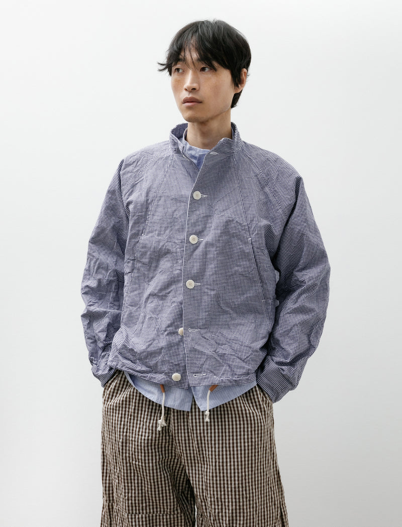 A tailored, cropped, shaped button-front shirt cut from a washed, crisp, cotton/linen/wool Kelsch cloth in a white-on-black check. Features a standless collar, barrel cuffs, Unkruid's signature curved sleeves, and a gently curved hem. Inset panels at the sides meet the front and back at curved "corset" seam lines, combining with horizontal fisheye "pinch" darts to create a highly nuanced silhouette that sits slightly closer to the body through the chest, but expands gently at the hem. Constructed using fine, single needle felled seams throughout for a long lasting, encased finish; Corozo buttons throughout.