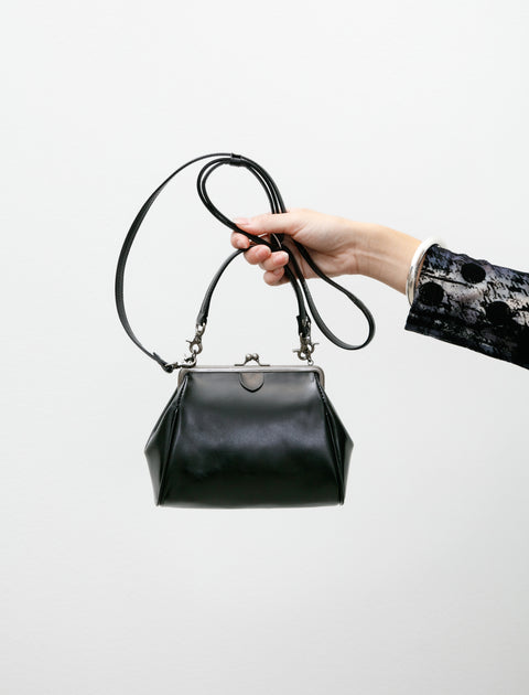 This simple black bag can easily transform for any occasion. Made of leather, the small pouch shape is perfect for keeping your necessities close by. It fastens with a metal kisslock closure that adds a touch of classic charm. The removable and adjustable long strap allows you to wear this bag across the body, while a cute little top handle gives you the option to use it as a handbag.