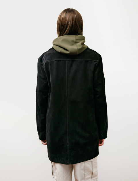 Long sleeve suede jacket cut from black calf leather featuring a vintage inspired spread collar and thoughtfully finished with tonal washed brown stitching throughout. Lined throughout with a viscose/cotton blend and detailed with an interior snap closure chest pocket, and a soft green corduroy lined collar for comfortable wear.