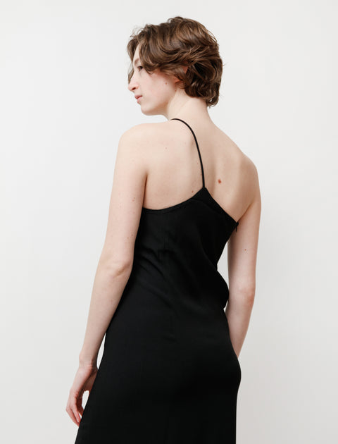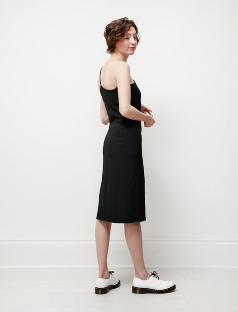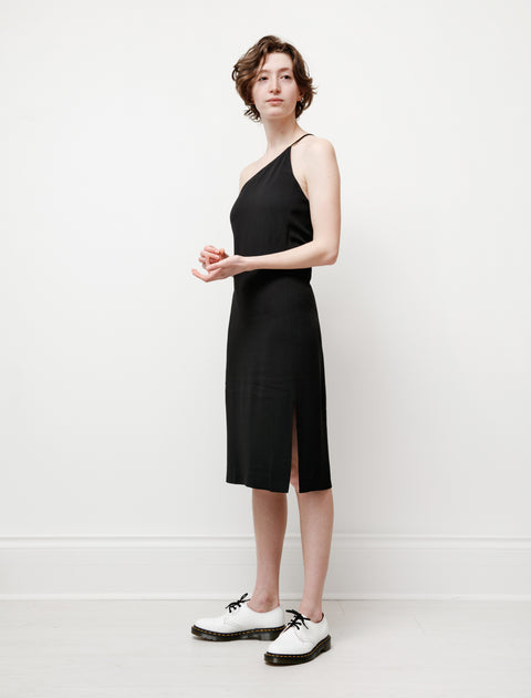 A playful number with a sleek and flirty cut that proves less is more. Its dainty single spaghetti strap at the neckline draws attention to the collar bone, ascending to a straight fit adorned with a cheeky side slit for movement that falls just above the knee. Featuring a hidden side tonal black zipper, crafted from medium weight crepe fabric and lined in black satin… this is our dream little black dress.