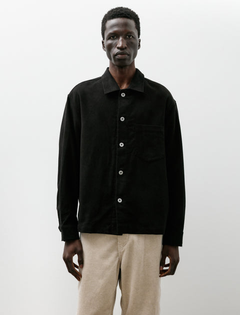 James Coward's signature relaxed fitting, boxy, work shirt cut from a lightweight, brushed cotton moleskin in black. Features a convertible collar, an updated closure with matte finished tack buttons, a left breast pocket, a single layer rear yoke with subtle pleats at the shoulders, and a flat hem. Easy proportions through the chest and shoulders combine to produce an effortless functional silhouette. Constructed using fine, single needle flat felled seams throughout for a long lasting, encased finish.