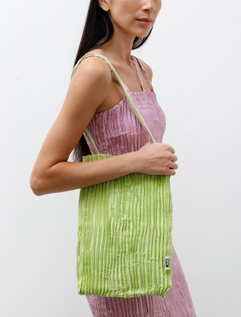 For a day on the go or an evening out, the bags narrow, long shape stores your necessities without ever being imposing. Made from hand-pleated satin silk, dyed a bright green for a pop of colour. It's shimmer is achieved by botanically dyeing the silk with a combination of chlorophyll and reseda, a herbaceous plant.