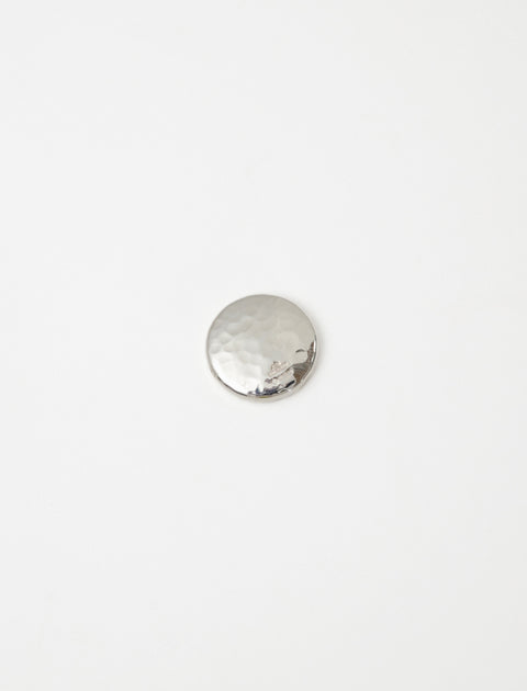 A classic 23mm pin badge in 925 sterling silver. Features a Bunney logo stamp at the face and a hammered finish that catches light beautifully. Completed with a d-pin closure at the back.