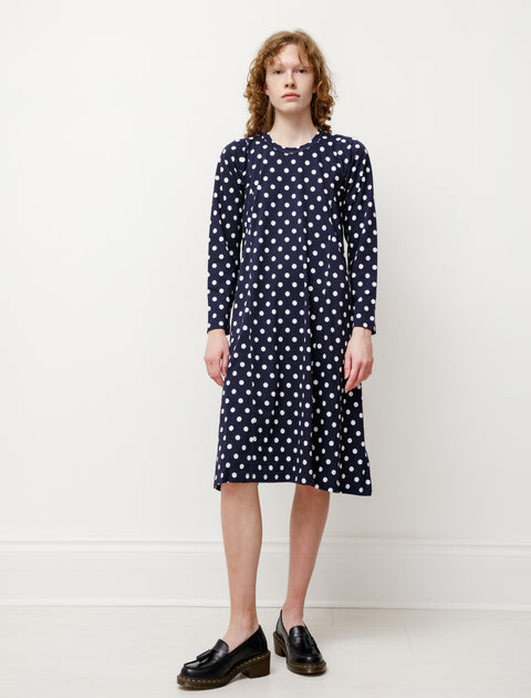 Featuring a unique patchwork construction through the shoulder, sleeve and body that ascends to a full A-line shape, ease into summer weather with this effortless and sweet t-shirt dress. Cut from a soft cotton jersey in navy adorned with Rei Kawakubo's staple polka dot pattern.