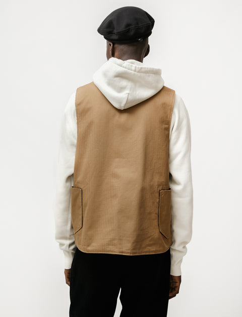 The Over Vest comes reversible for double the functionality. One side features a caramel herringbone twill and its opposite features an acrylic faux fur that provides warmth and plush hand feel. Details include a slight A-frame fit, three-button closures on both sides of the placket as well as two sections of large patch pockets.