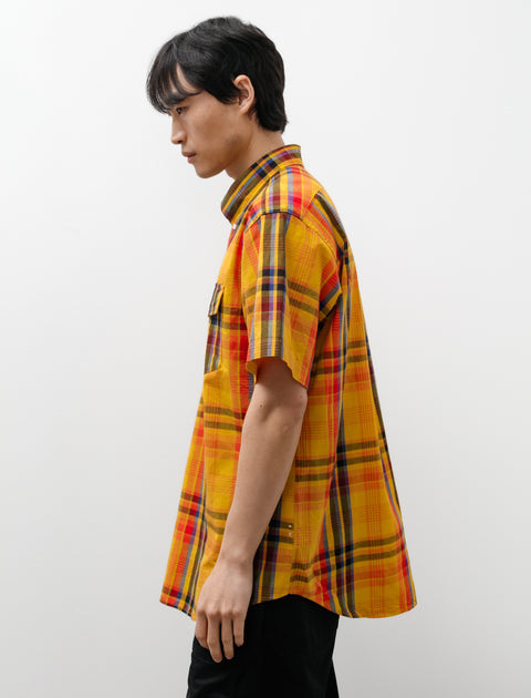 A relaxed fitting, short sleeved popover collared shirt cut from a yarn dyed, multi toned, cotton plaid. Features a button down collar, a single patch pocket at the left breast with a buttoned flap closure, a generous box pleat with hanging loop at a bias cut clean finished back yoke. Three button closure features a unique fold-over finishing technique that creates a pleat at the front panel. Constructed with flat felled seams throughout; finished with mother of pearl buttons.