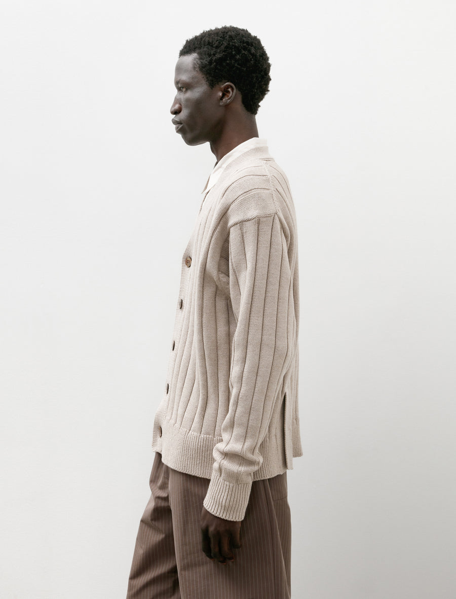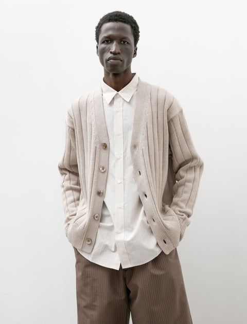A loose fitting, boxy, button-front cardigan knit from a three-ply, smooth surfaced cotton yarn in a medium beige. The rib-knit structure encourages drape through the shoulders, lending a soft silhouette that is accented by movement created with vent pleats at the back. Constructed using full-fashion knit panels and linked seams for a long lasting shape that is resistant to warping; oversized, dark tone Mother of Pearl buttons.