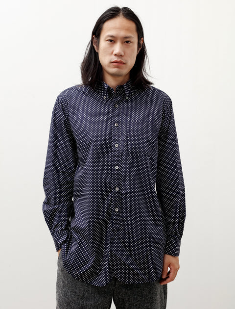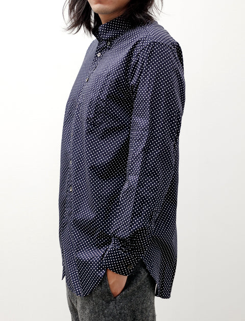A relaxed fitting long sleeve button shirt in a white on navy polka dot printed cotton sateen. Patch pocket at left breast. Features a button-down collar with pointed collar tips, back yoke with central box, pleat micro pleating detail at button cuff. Curved hem with dropped back hem and gusset reinforcement at side seams. Fully felled seam finishing with clean finished, two-piece yoke.