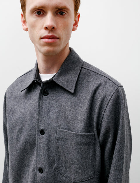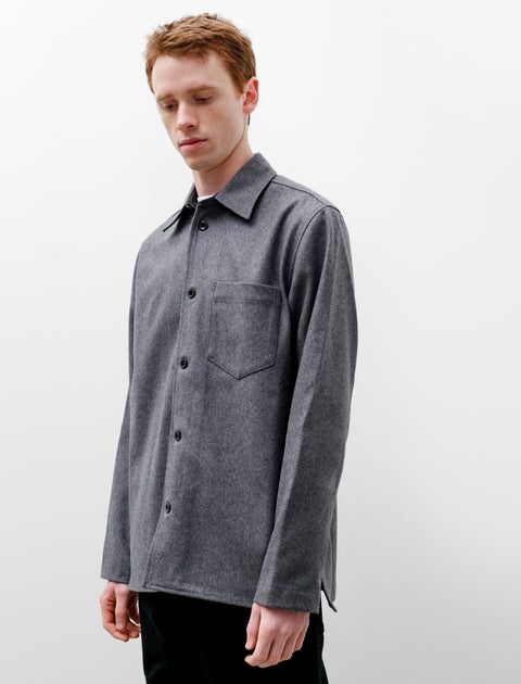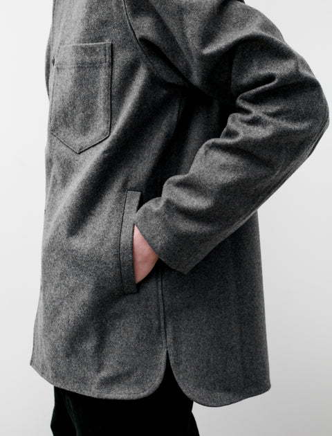 A relaxed fitting overshirt cut from a heavy, blended wool melton in a melange mid grey. Features a classic shirt collar lined with fine cotton twill in black for improved next to skin comfort at the neck, a patch pocket at left breast, and two welted pockets at waist. Back constructed with a two piece clean finished yoke and features a box pleat at centre back. Two piece, cuffless sleeve lends an elegant forward stance at the shoulder and elbow. Gently curved hem at side seams, split side seams.