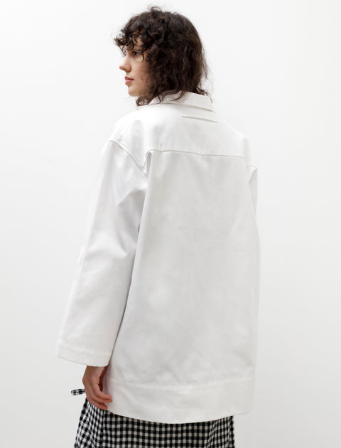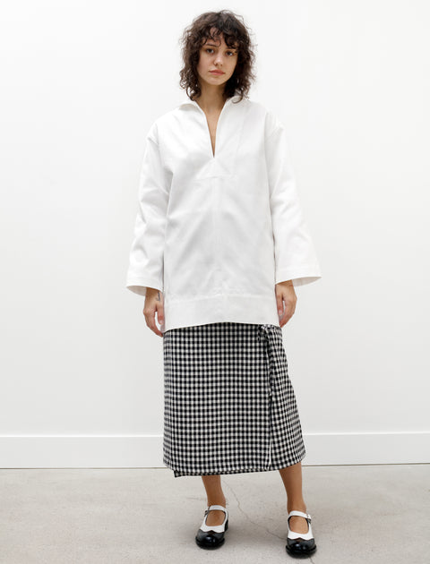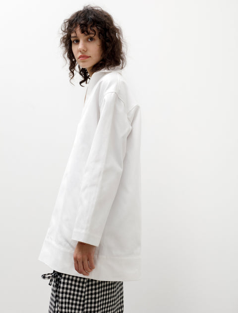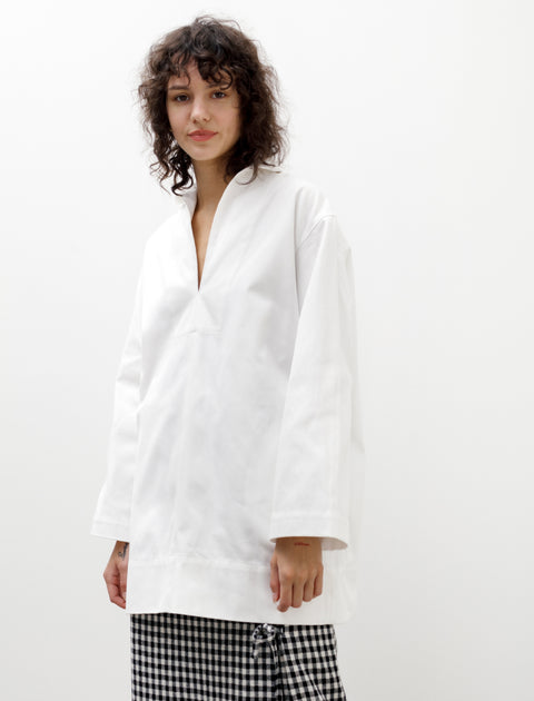An oversized tunic style dress in structured twill cotton. Marine-inspired, without feeling too costumey, this dress is detailed with a modern sailor collar, minimal placket and wide sleeves. This structured dress provides many options for layering, shown in the brand's lookbook over a checked wrap skirt. We imagine this piece to wear wonderfully over pants as well.