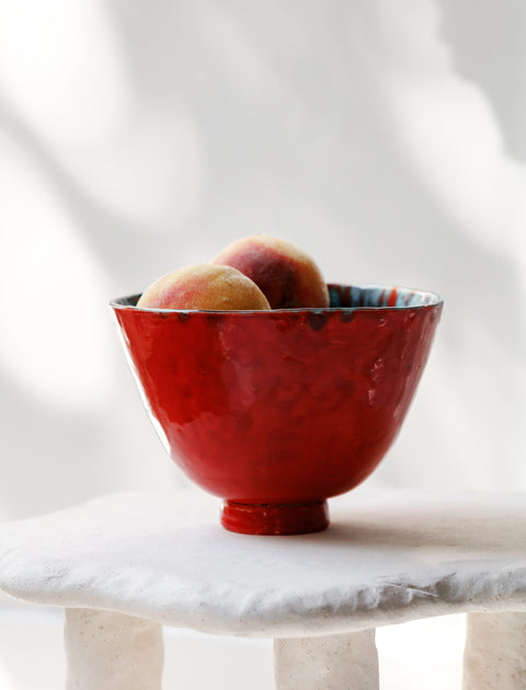 A one of a kind piece thats sure to make a statement at the table. This stunning hand formed bowl with foot displays its supple colour and vibrant sheen in a bold yet elegant fashion. Its contrasting crackling inner glaze beautifully highlights the contents within it.