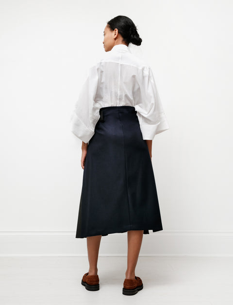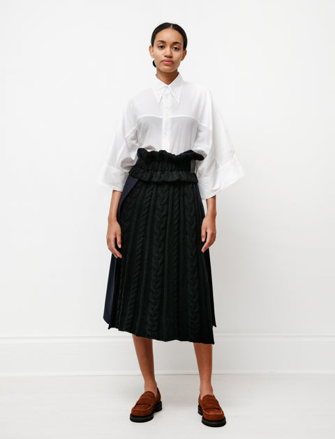 Timeless and incredibly unique all at once… this skirt is comprised of a dense navy wool, finished with a black cable knit front that’s oh so soft and lined to protect your legs from the cold. Detailed with a sweet ruffled edge top and a leather snap closure at the side to accentuate the waist!