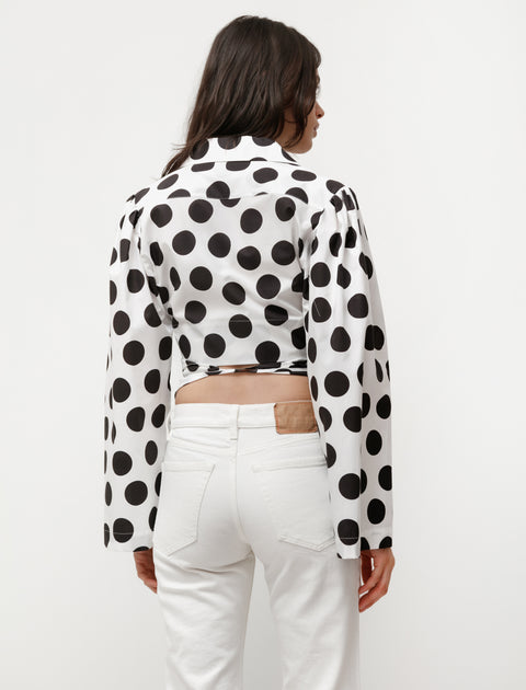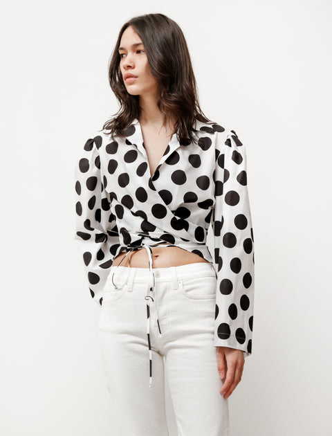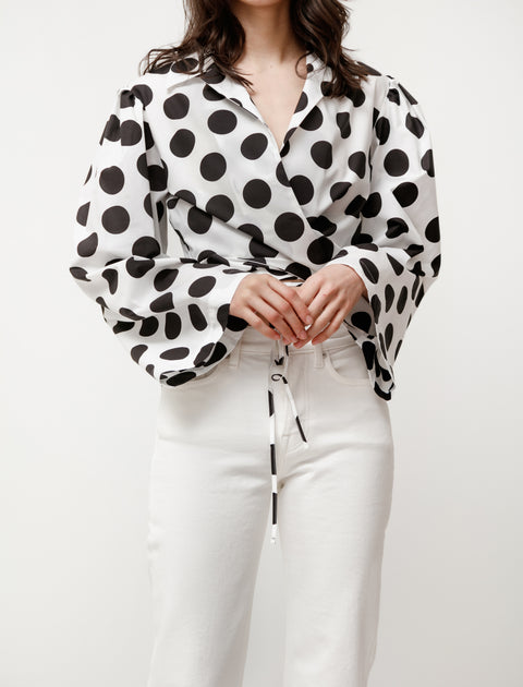A simply adorable and incredibly fun wrap cotton blouse from Hache. The bold polka dot print is the perfect pop to add to your summer wardrobe. Featuring a timeless notched lapel, wide sleeves with ruching at the shoulder for some volume and a cropped fitted bodice. We envision this blouse dressed up with a skirt or wrapped over your swimsuit as a charming coverup.